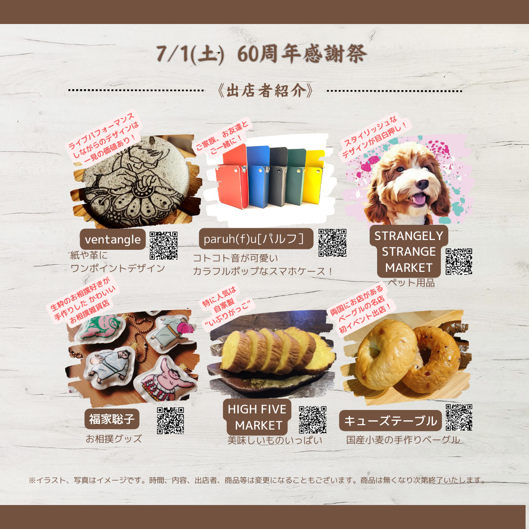 7月1日(土)に”60周年感謝祭”実施いたしました。 あいにくの天気の中の開催となりましたが、たくさんのお客様にお越し頂き、盛況のうちに終えることができました。 こうして無事60周...